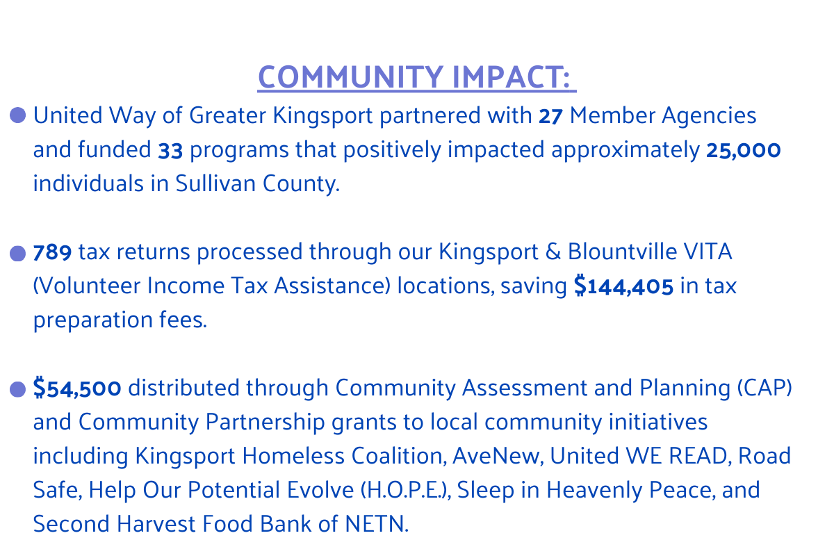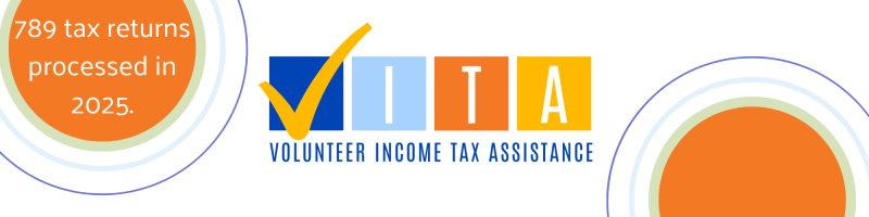 Kingsport VITA (Volunteer Income Tax Assistance) continued in 2025. VITA is a partnership with the IRS where volunteers assist in filing taxes for free for those who qualify. VITA was able to process 789 federal tax returns in 2025, saving $144,405 in tax preparation.