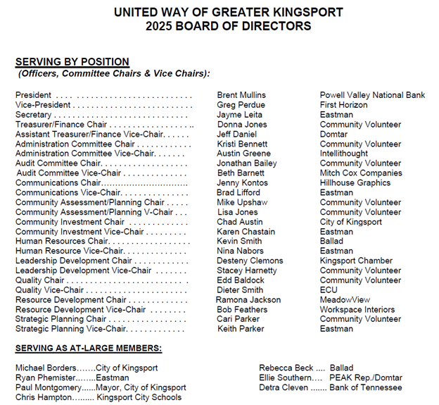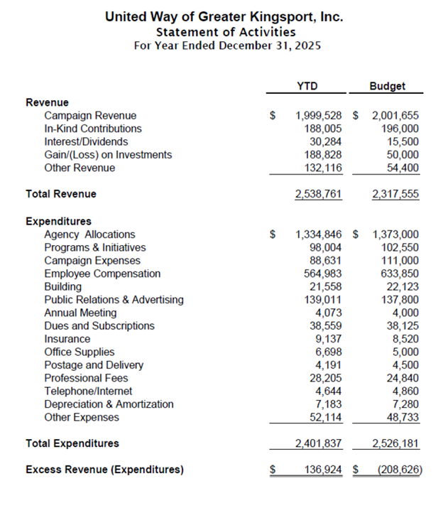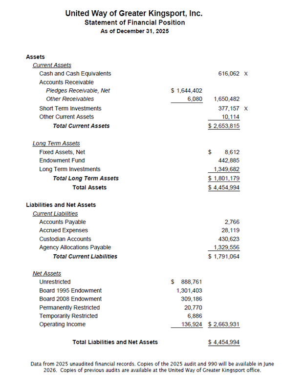 Data from 2025 unaudited financial records. Copies of the 2025 audit and 990 will be available June 2026. Copies of previous audits are available at the United Way of Greater Kingsport office.