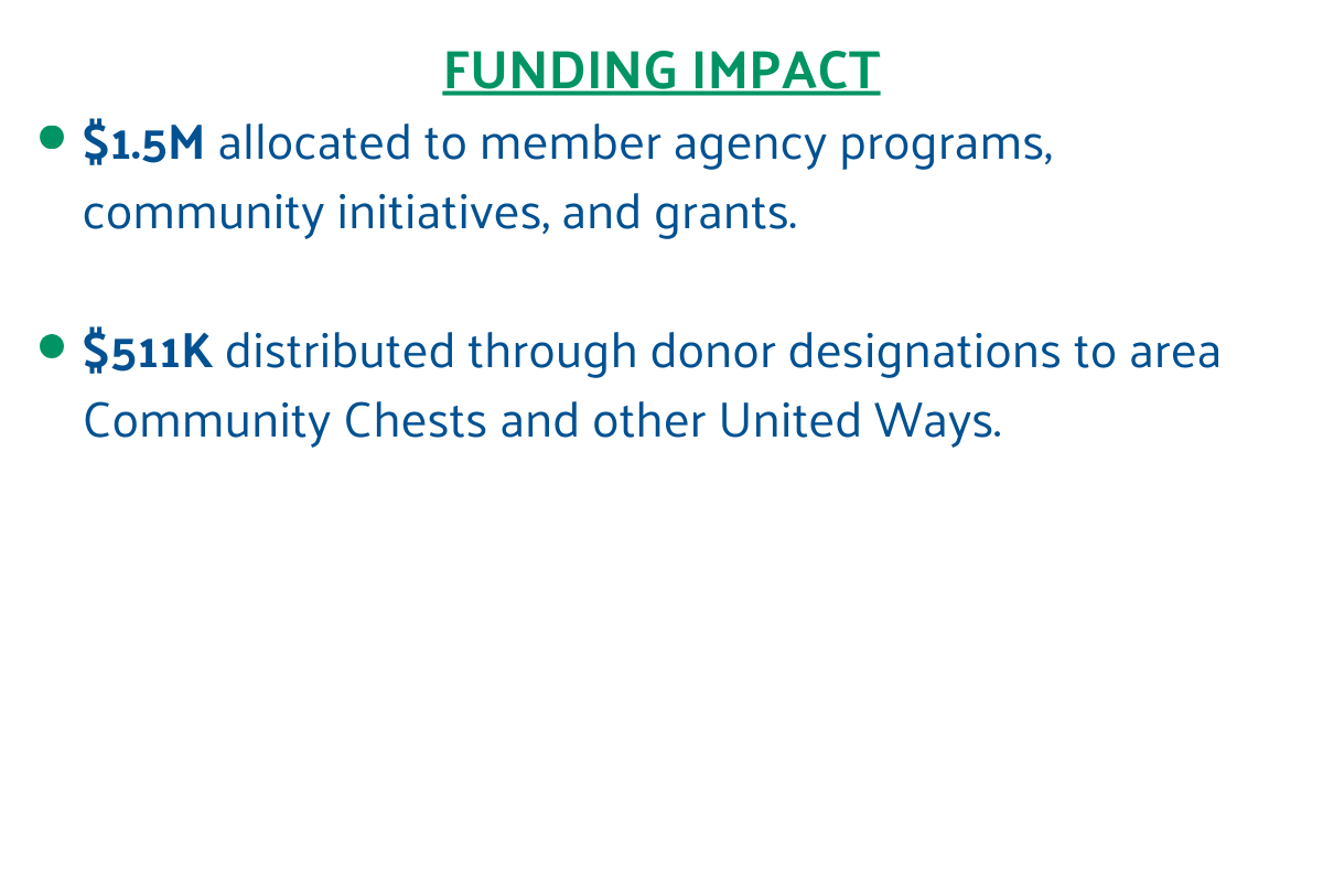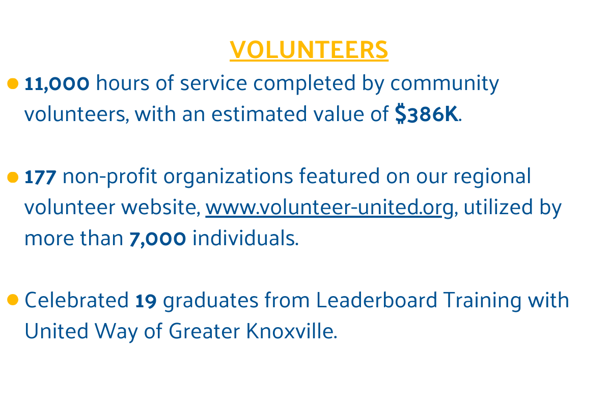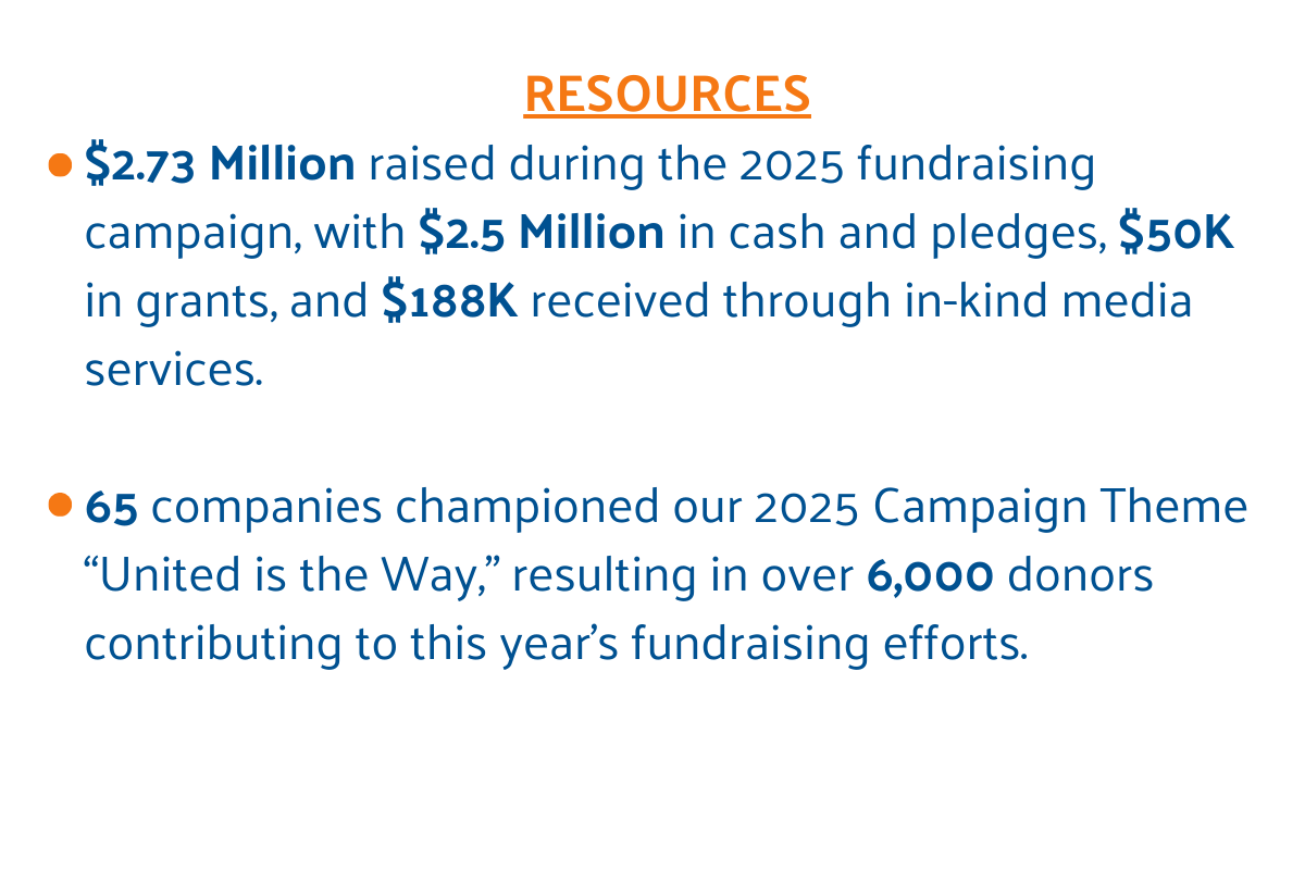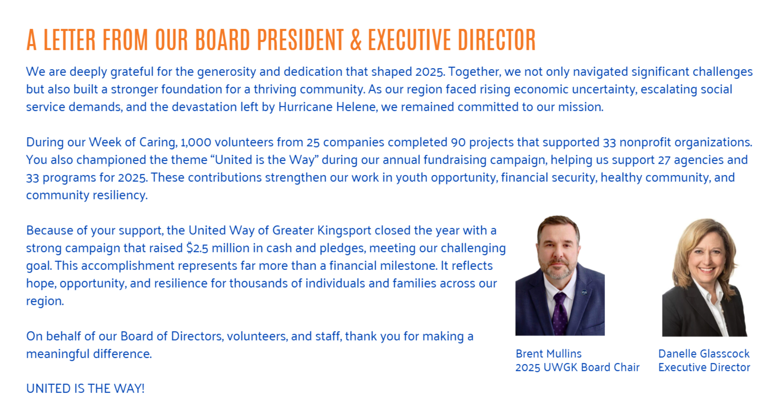UWGK’s 2025 campaign theme was “United is the Way" focusing on United Way of Greater Kingsport’s impact across the areas of the youth opportunity, financial security, healthy community and community resiliency. Thank you to every donor, volunteer, and service provider in our area who helped raise the $2.7 Million for this year’s campaign! Because of your generosity, we can continue to make the life of every person in our community better.