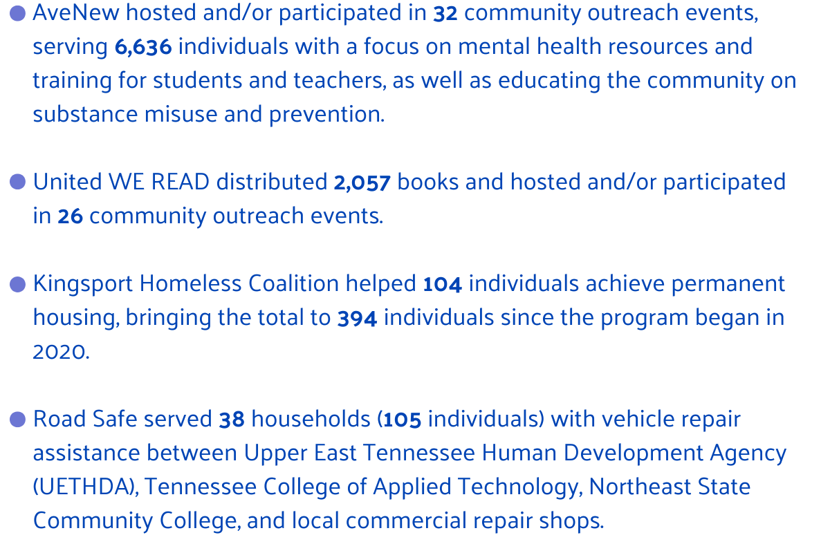 Upper East Tennessee Human Development Agency – Community Service Neighborhood Assistance Program ($22,596) Provides rental and utility assistance, and employment needs for the prevention of homelessness through financial literacy and life coaching.